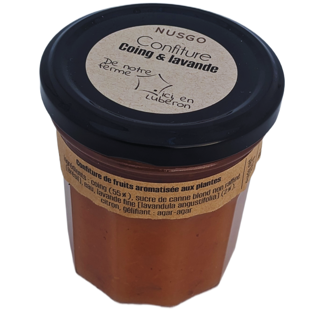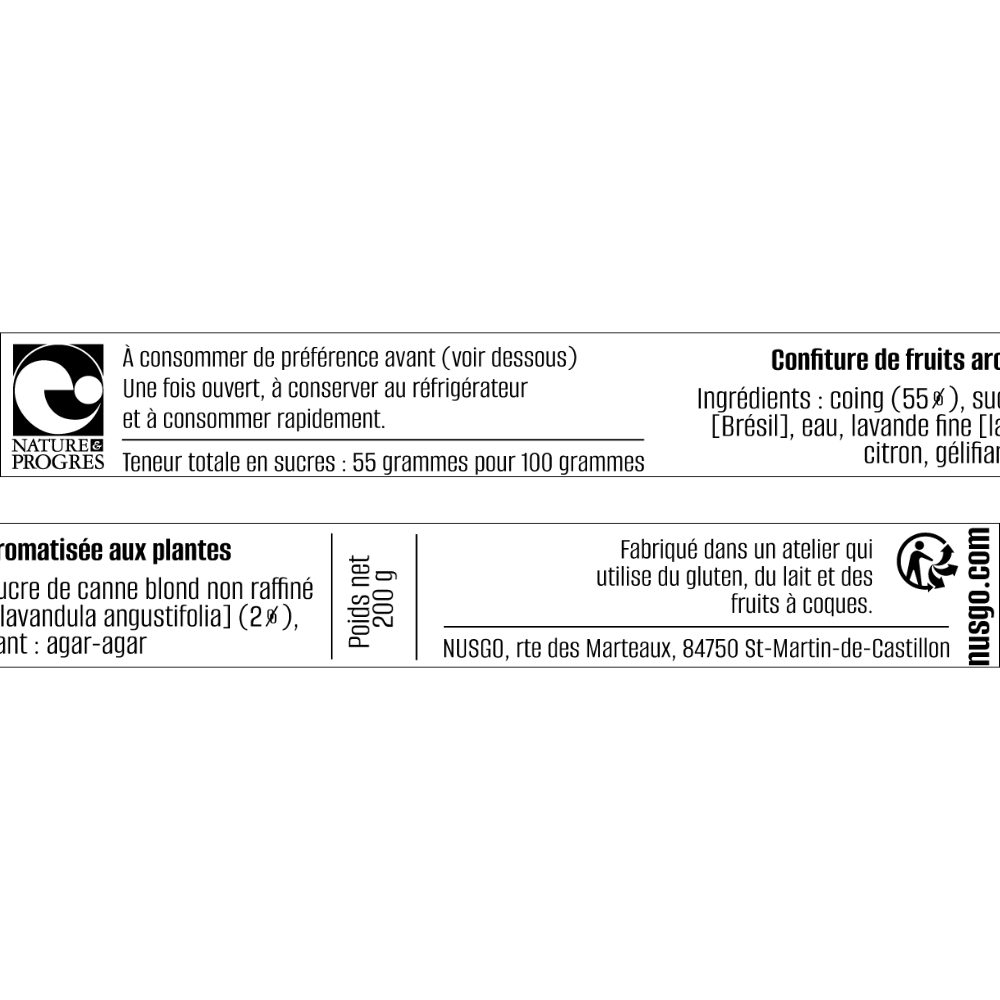 Coing (41%), sucre de canne blond non raffiné [Brésil], eau, pommes, lavande fine [lavandula angustifolia] (2%), citron, gélifiant : agar-agar.