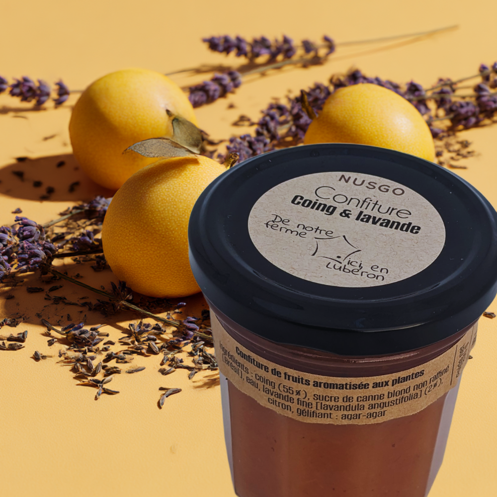Confiture douce et florale de coings cueillis à maturité, subtilement relevée par la délicatesse aromatique de la lavande provençale.