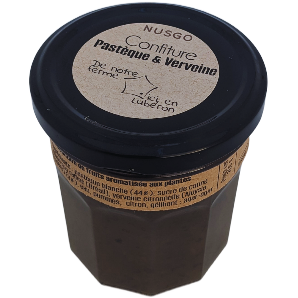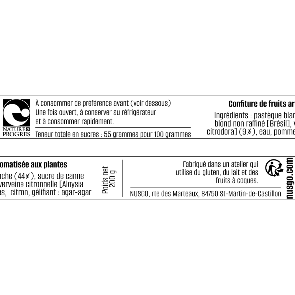 Pastèque blanche (46%), sucre de canne blond non raffiné [Brésil], verveine citronnelle [Aloysia citrodora] (10%), pommes, citron, gélifiant : agar-agar.