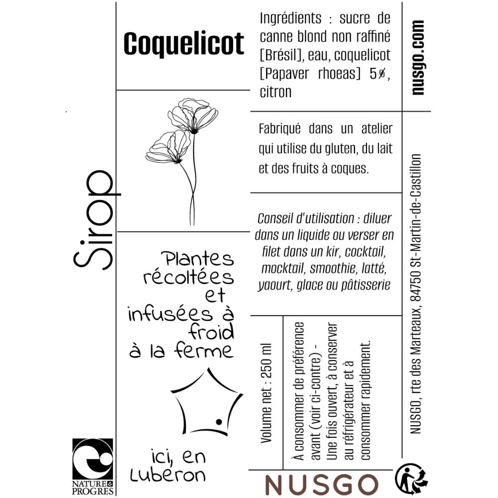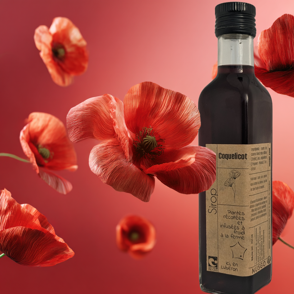 Découvrez la douceur délicate de notre sirop de coquelicot, préparé artisanalement à la ferme NUSGO, au cœur du Luberon. Les pétales de coquelicot, cueillies à la main dans nos champs en agroécologie, infusées à froid pour préserver toute leur finesse, offrent un parfum floral subtil et quasi fruité.