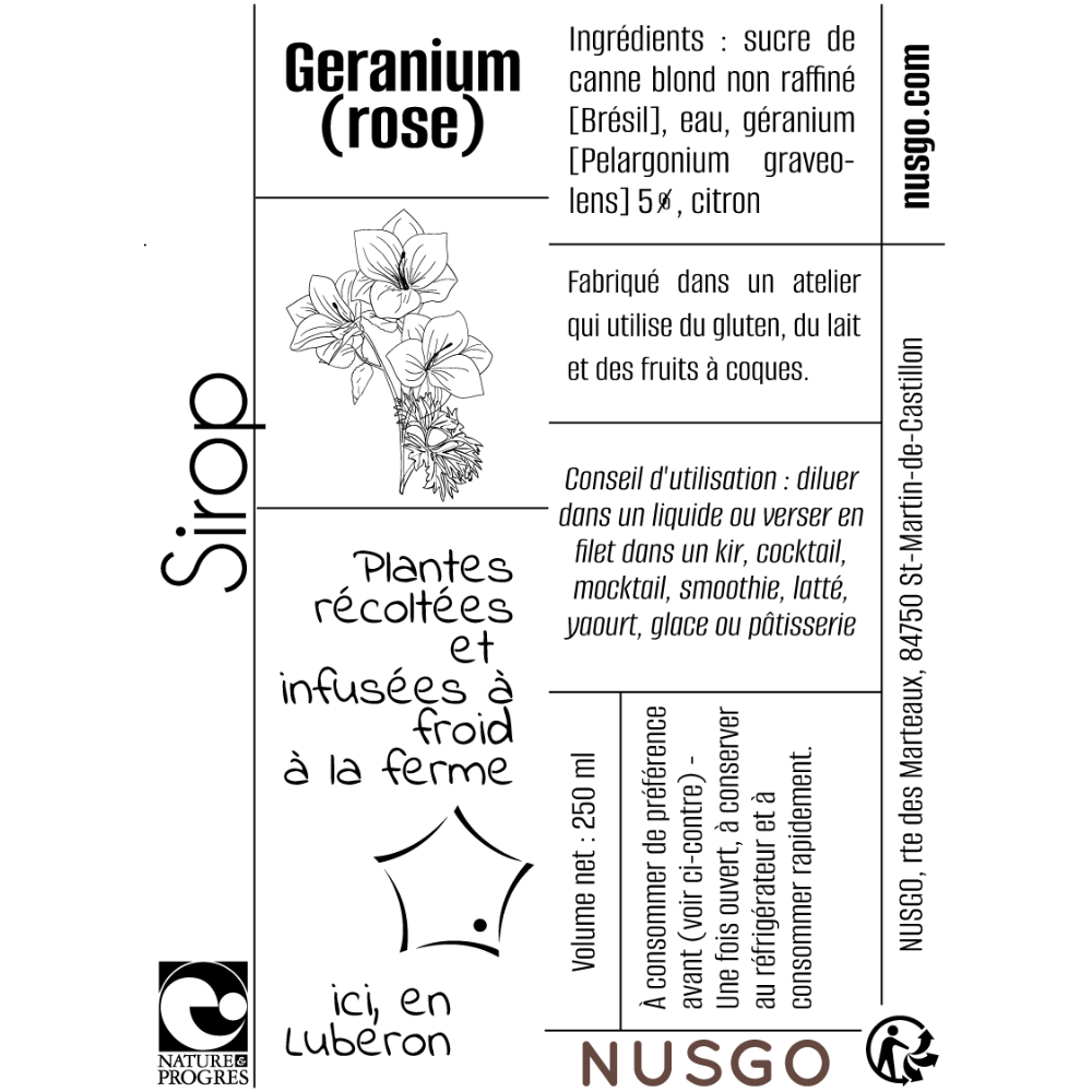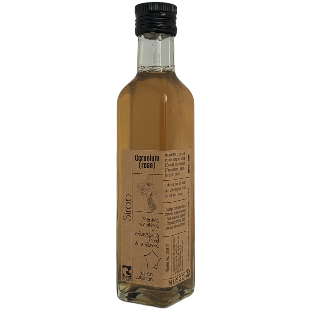 Floral et délicatement parfumé à la rose, notre sirop de géranium rosat est élaboré à partir des feuilles du géranium soigneusement récoltées sur la ferme. Sa douceur subtile fait de ce sirop un ingrédient raffiné et gourmand.